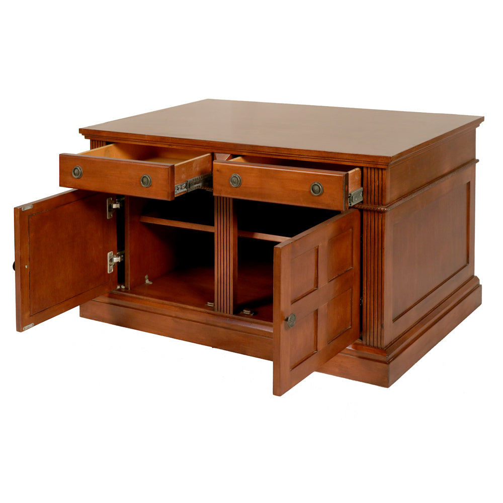 A piece that harkens back to royal splendor, this library contains six shelves with a solid wood frame and inset glass. It has an overhead light to display its contents.