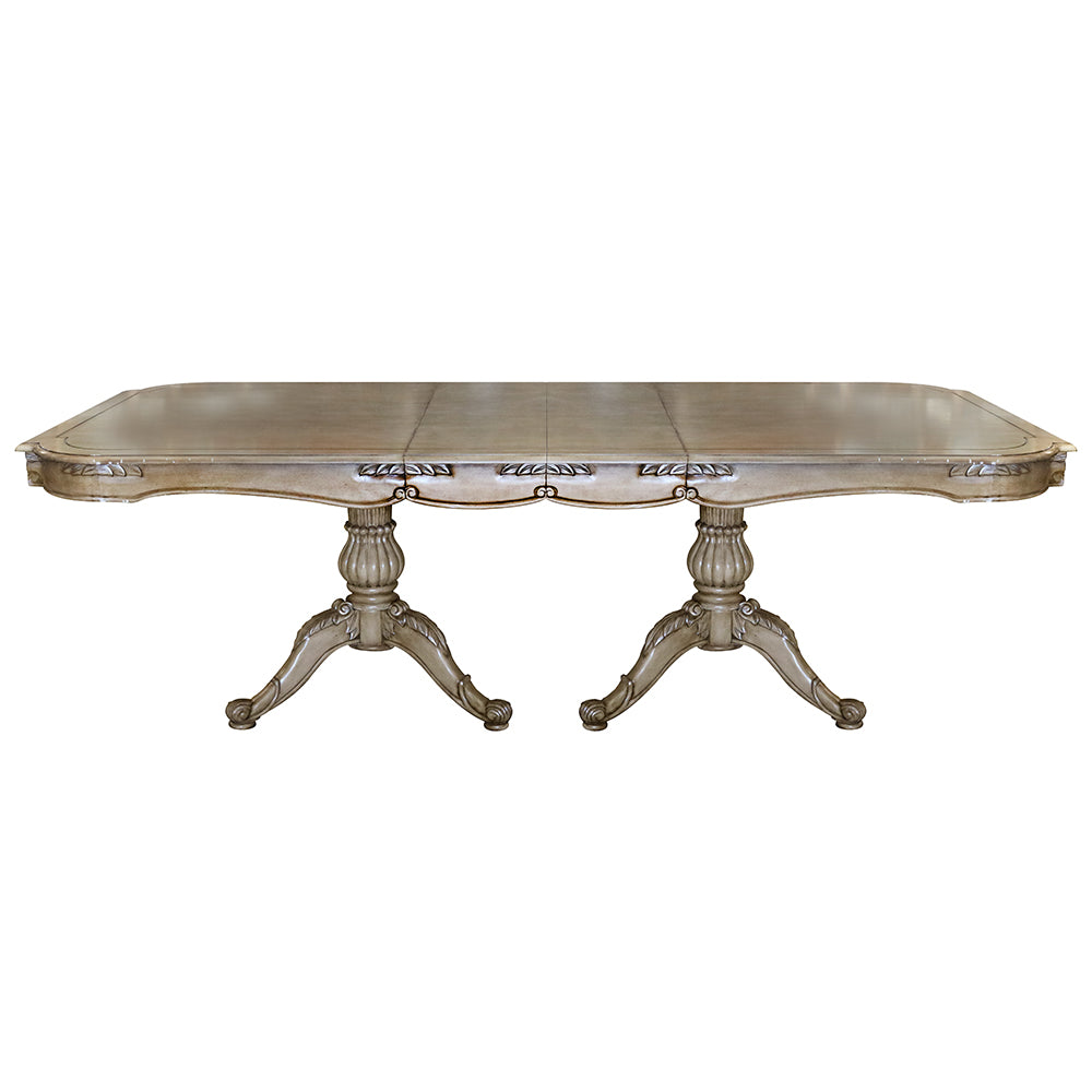 Introducing the French Extendable Louis Pedestal Dining Table S087T-1, a stunning piece that combines classic French design with modern functionality. This exquisite table features two beautifully carved pedestals and an antique white finish, designed with extensions to accommodate your dining needs. It’s a perfect addition to any sophisticated dining space.