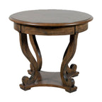 Featuring a walnut-finish wood construction, this circular accent table exudes timeless elegance. Its one-shelf design offers practical storage and visual interest, while its graceful curved legs add whimsy and sophistication to its silhouette.
