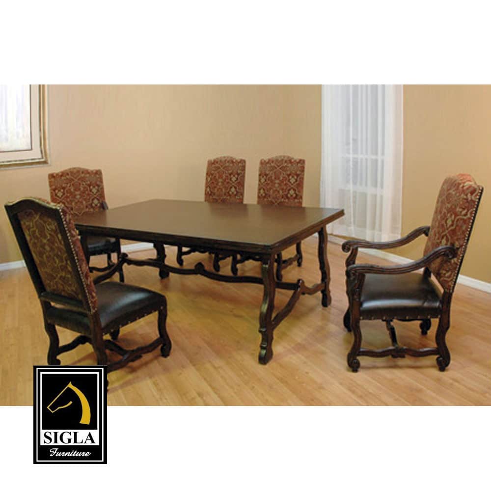 This Tuscan Hill Dining Set Includes 4 Side Chairs, 2 Arm Chairs, and a Rectangular Wood Top Table. The Seats are Upholstered in Faux Leather and have Individual Decorative Nails, and the Backs are Upholstered in Fabric and have Nail Head Strips.