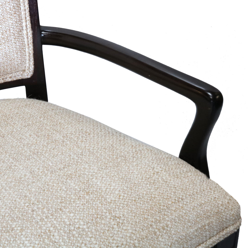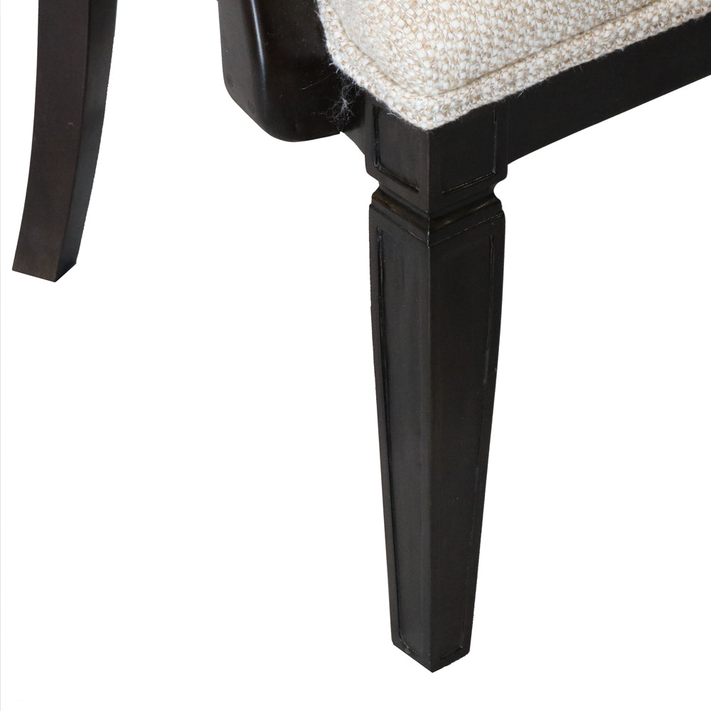 Crafted with comfort in mind, the chair features gently curved arms and a generously cushioned seat and backrest. The upholstery is made from premium, textured fabric that enhances its visual appeal and ensures durability and long-lasting comfort. Tapered legs complete the design, providing a stable foundation while maintaining a light and graceful silhouette.