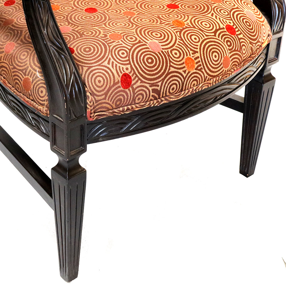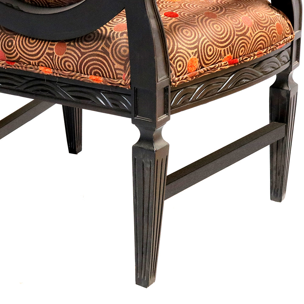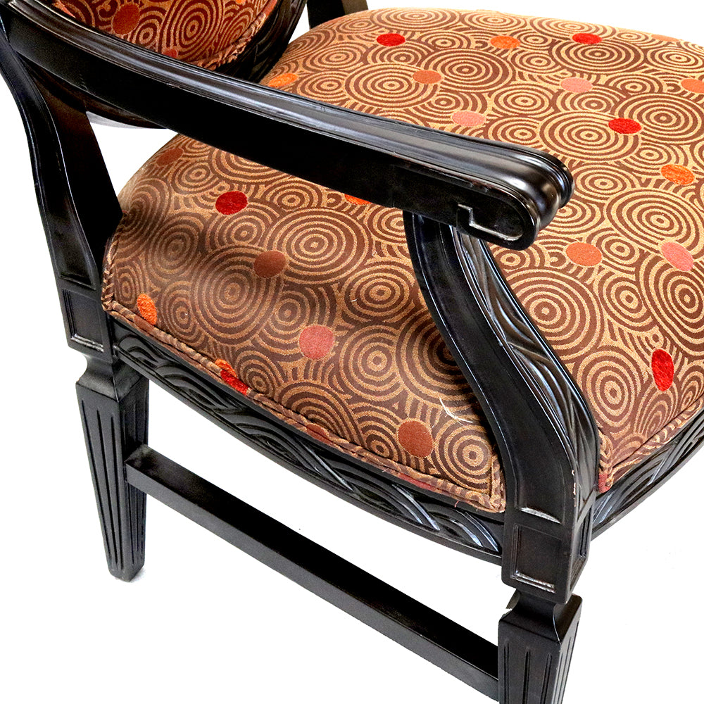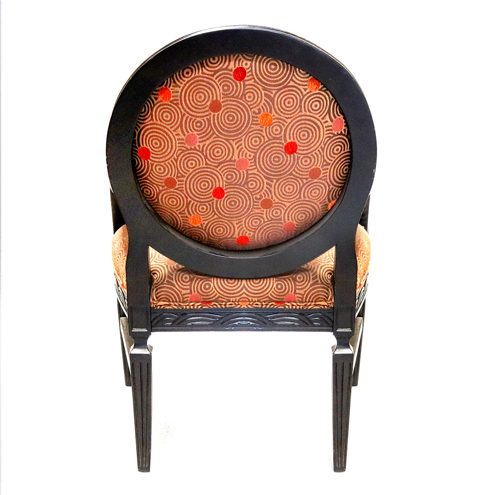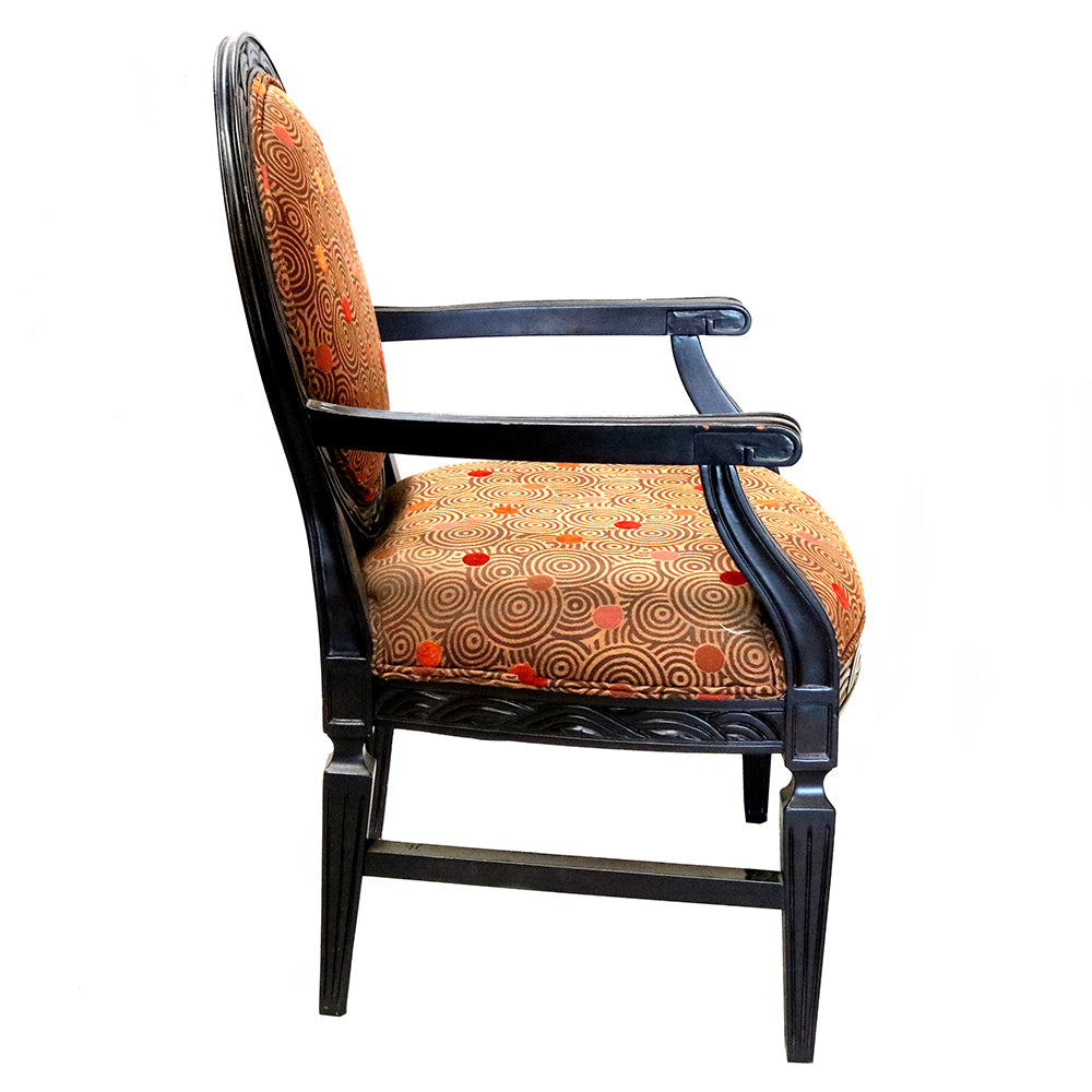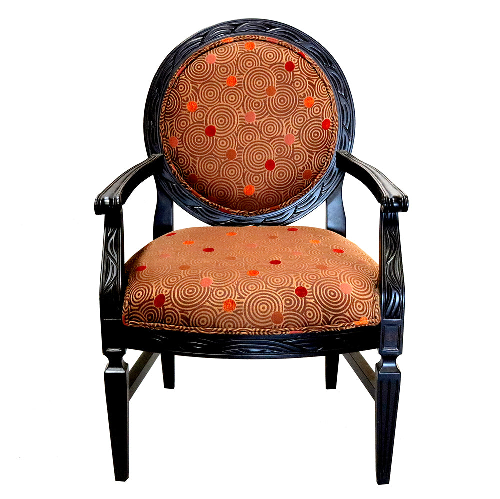 The seat and backrest are upholstered in a geometric-design fabric, providing a soft contrast against the bold black finish. The fabric offers a clean, minimalist touch, complementing the chair’s ornate frame while ensuring comfort. Its oval back design and graceful armrests bring a sense of stately grandeur, making it ideal for both formal and casual settings. This chair can be custom-made.