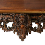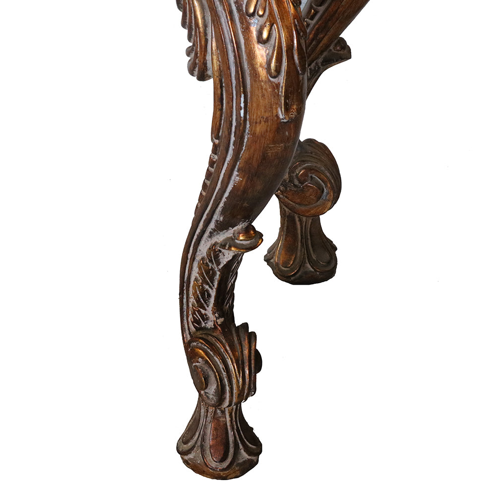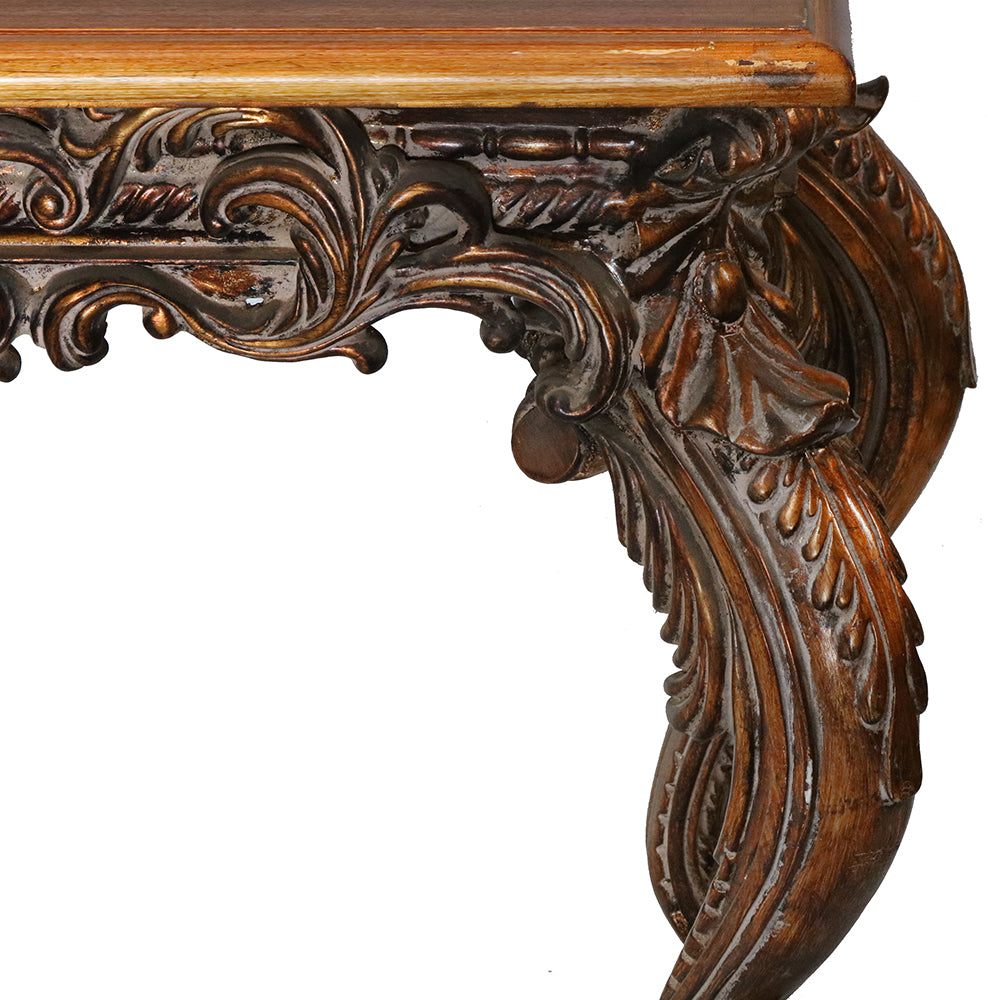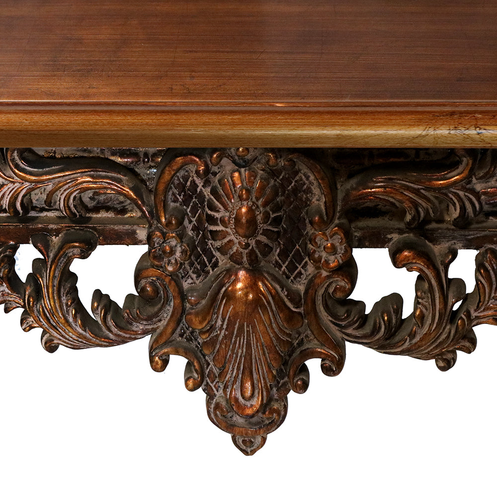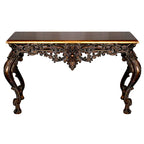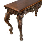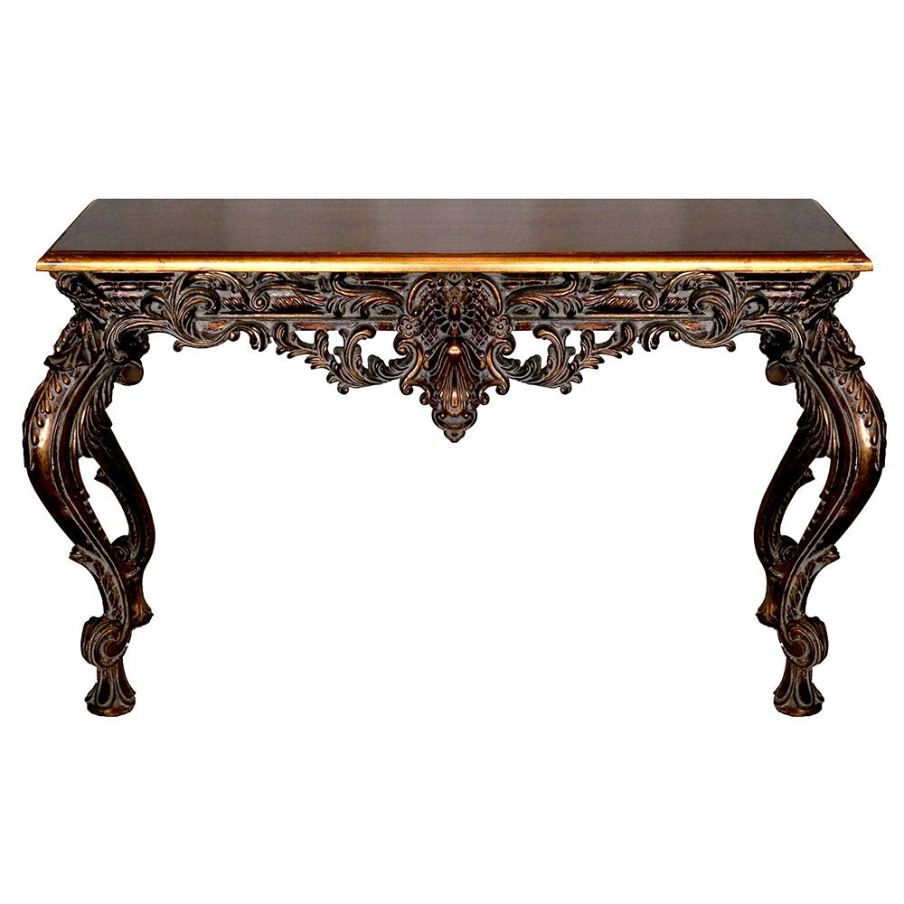 Finished in a rich antique bronze hue with delicately hand-applied highlights, this console table exudes old-world charm. The ornate carvings on the legs and apron showcase an unparalleled level of craftsmanship, making it an actual statement piece for any home. With its warm wood finish, the tabletop contrasts beautifully with the intricate carvings, creating a harmonious balance between form and function. Whether placed in an entryway, living room, or formal dining area, this console table enhances any space with its regal presence.