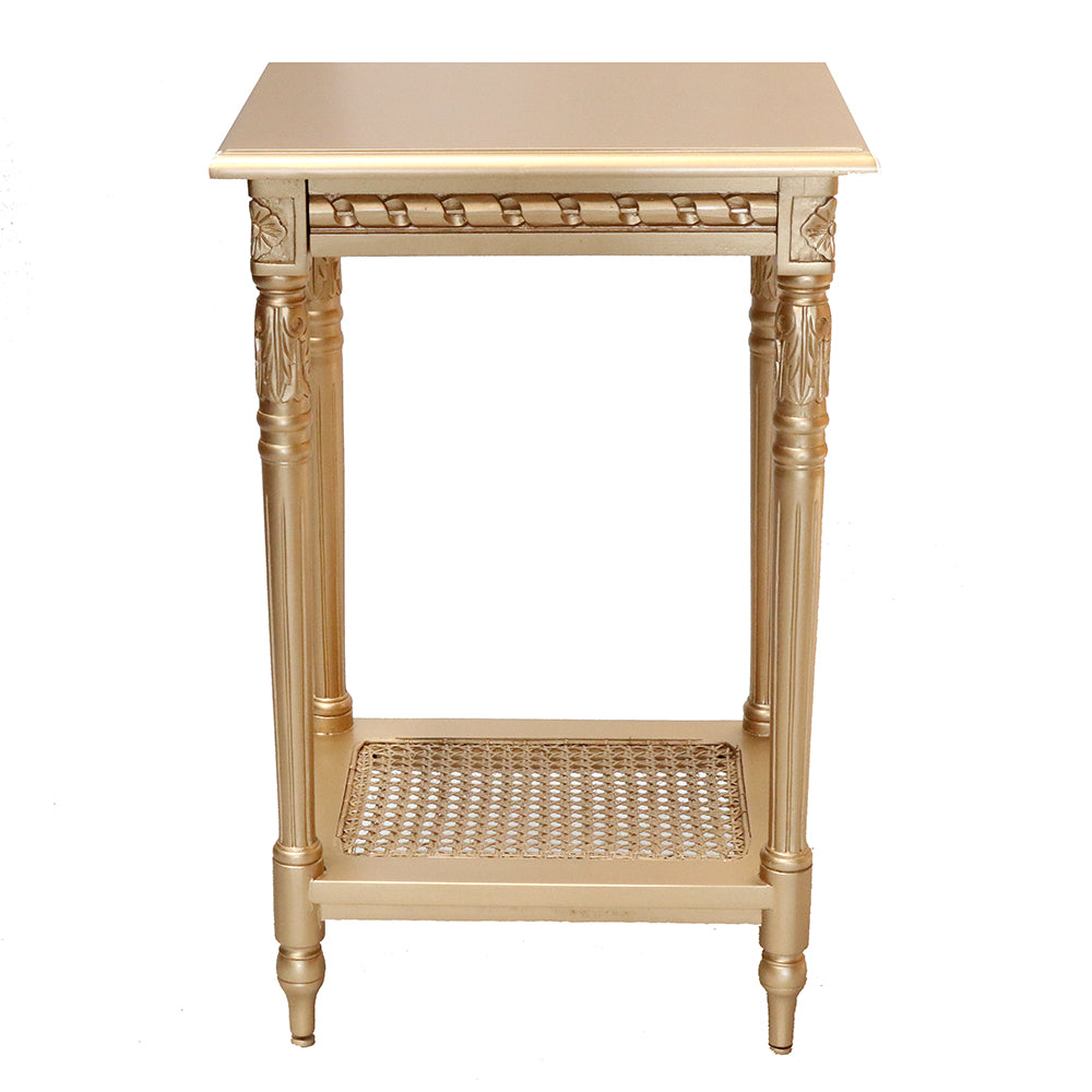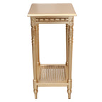 Introducing the Mandana Louis XVI Accent Table S875AT, a beautifully crafted piece that combines timeless Louis XVI design with exceptional craftsmanship. This small accent table is made of solid mahogany wood and features a bottom shelf, providing both functionality and elegance to any living space. The table is painted in a sophisticated antique silver finish, enhancing its classic appeal.