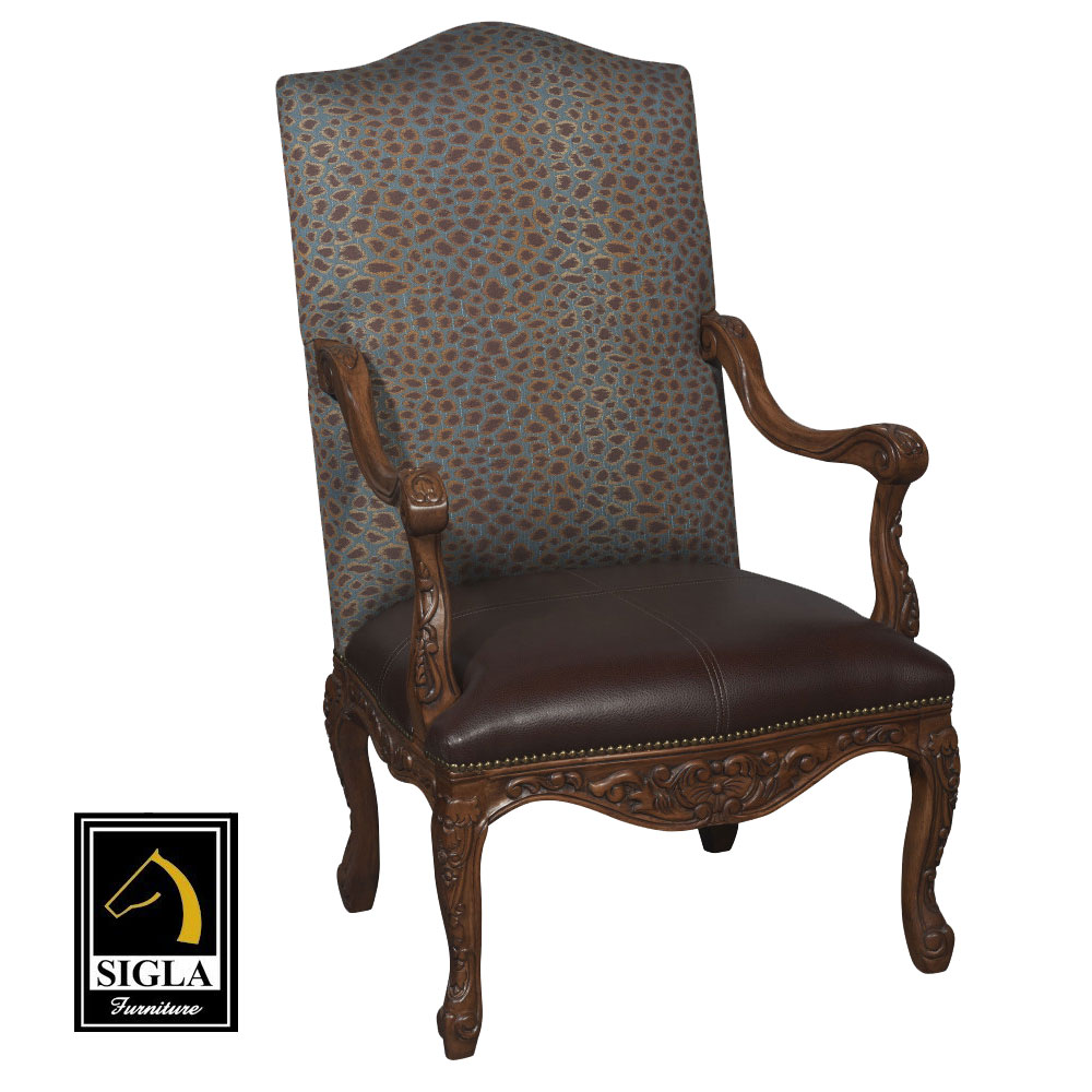 This Louis XV Italian Carved Lounge Chair is Finished in Dark Finish; its Seat is Upholstered in Dark Brown Real Leather, and the Back in Flower Pattern Fabric. This Louis XV Italian Carved Lounge Chair can be Custom-Made in different finishes and fabrics in our Los Angeles Factory, California. Call us for pricing. This Louis XV Italian Carved Lounge Chair is made from solid hardwood and finished and upholstered here at Sigla Furniture Factory.