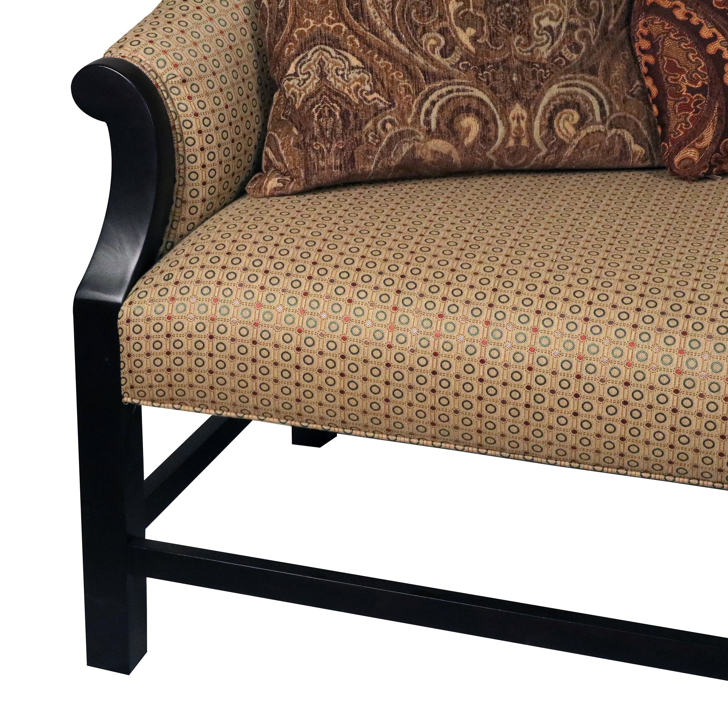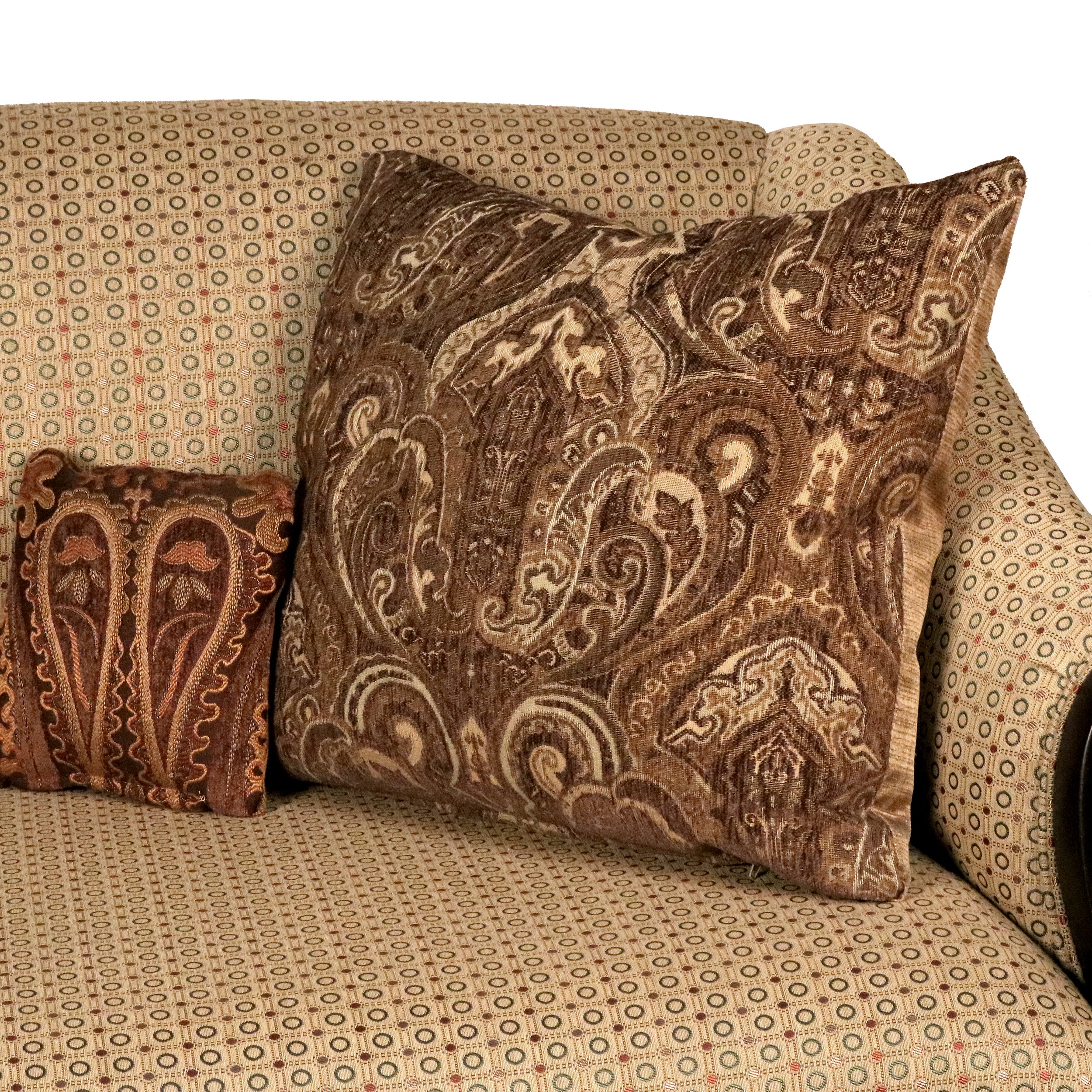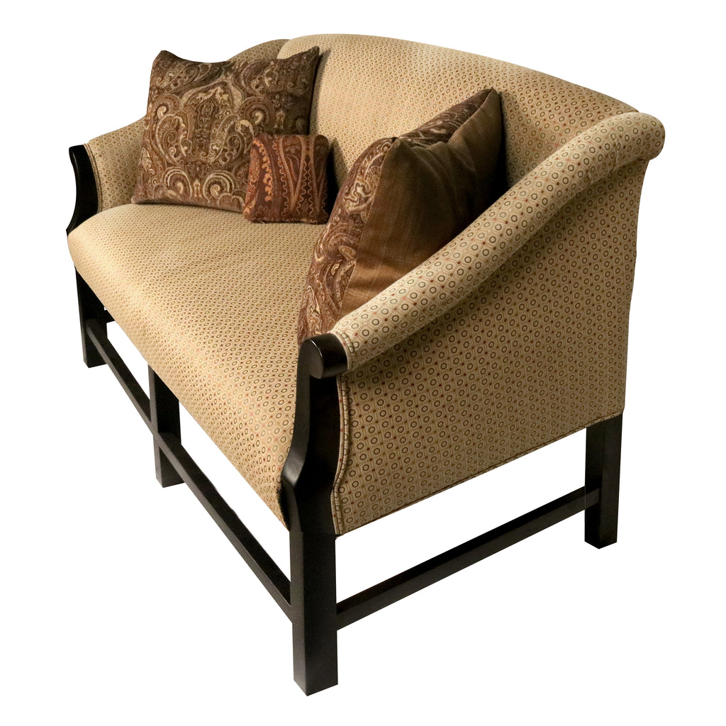 This 52" rolled arm loveseat brings a sophisticated touch to any room with its walnut polyester upholstery featuring a geometric pattern. The loveseat is constructed with a solid beech wood frame, known for its strength and durability, and is joined using tongue and groove techniques to ensure long-lasting stability. The fire-resistant upholstery is easy to maintain, while the tight back and seat design, filled with 1.8 lbs./cu. ft. density foam, offer firm and comfortable support. Suitable for both residential and commercial environments, this loveseat can accommodate up to 400 lbs., making it a stylish and practical seating option.